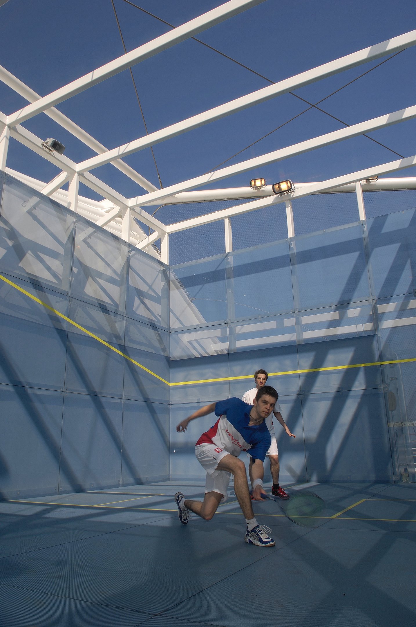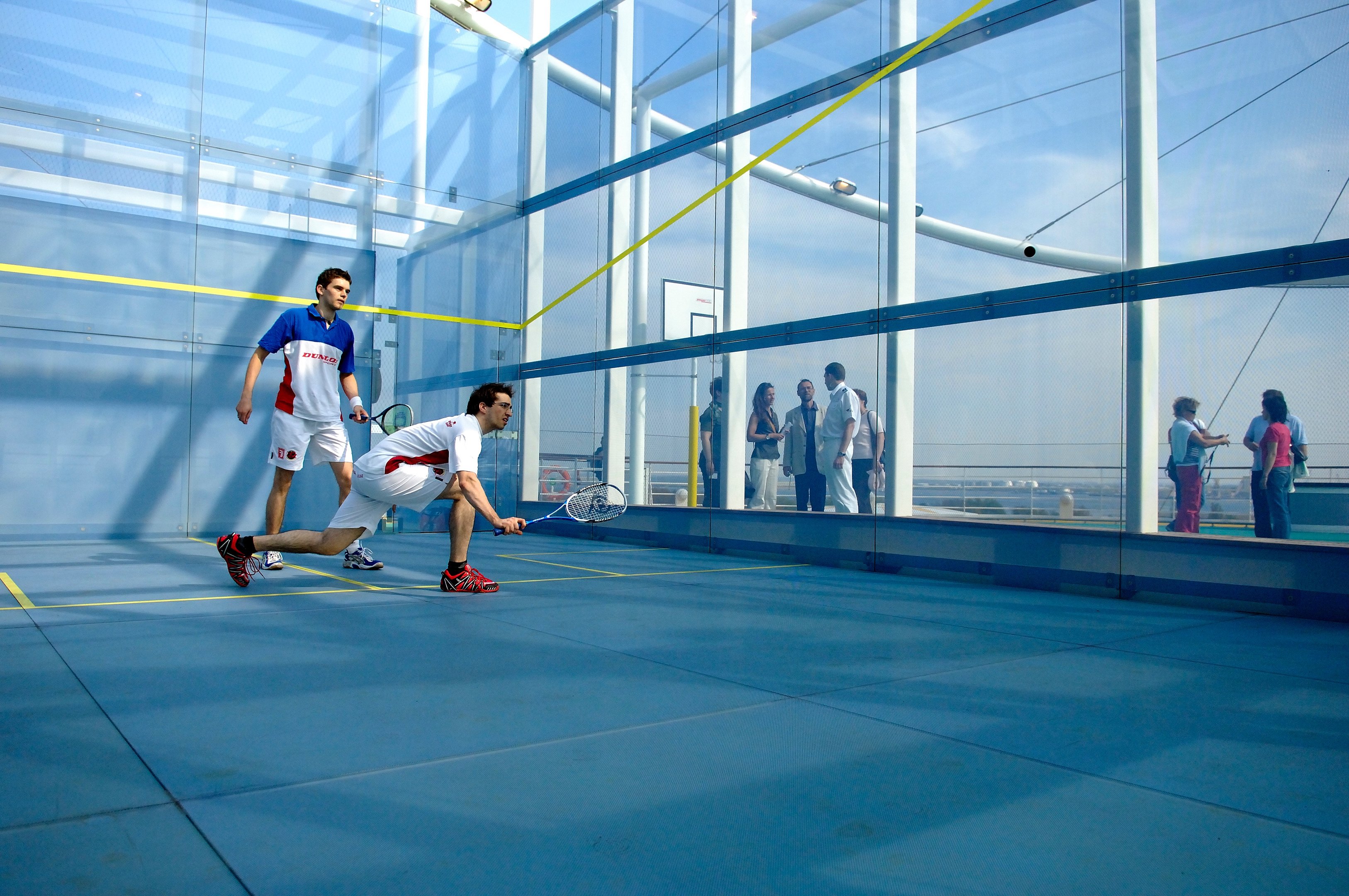 승객들은 태양 아래서, 또는 달빛 아래서 바다를 배경으로 특별한 스쿼시 경험을 즐길 수 있습니다.